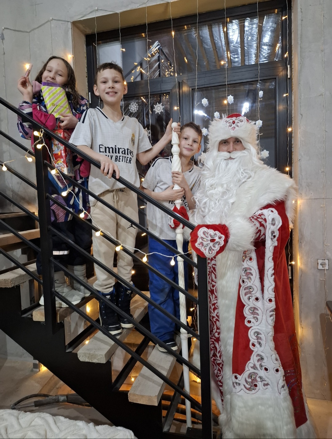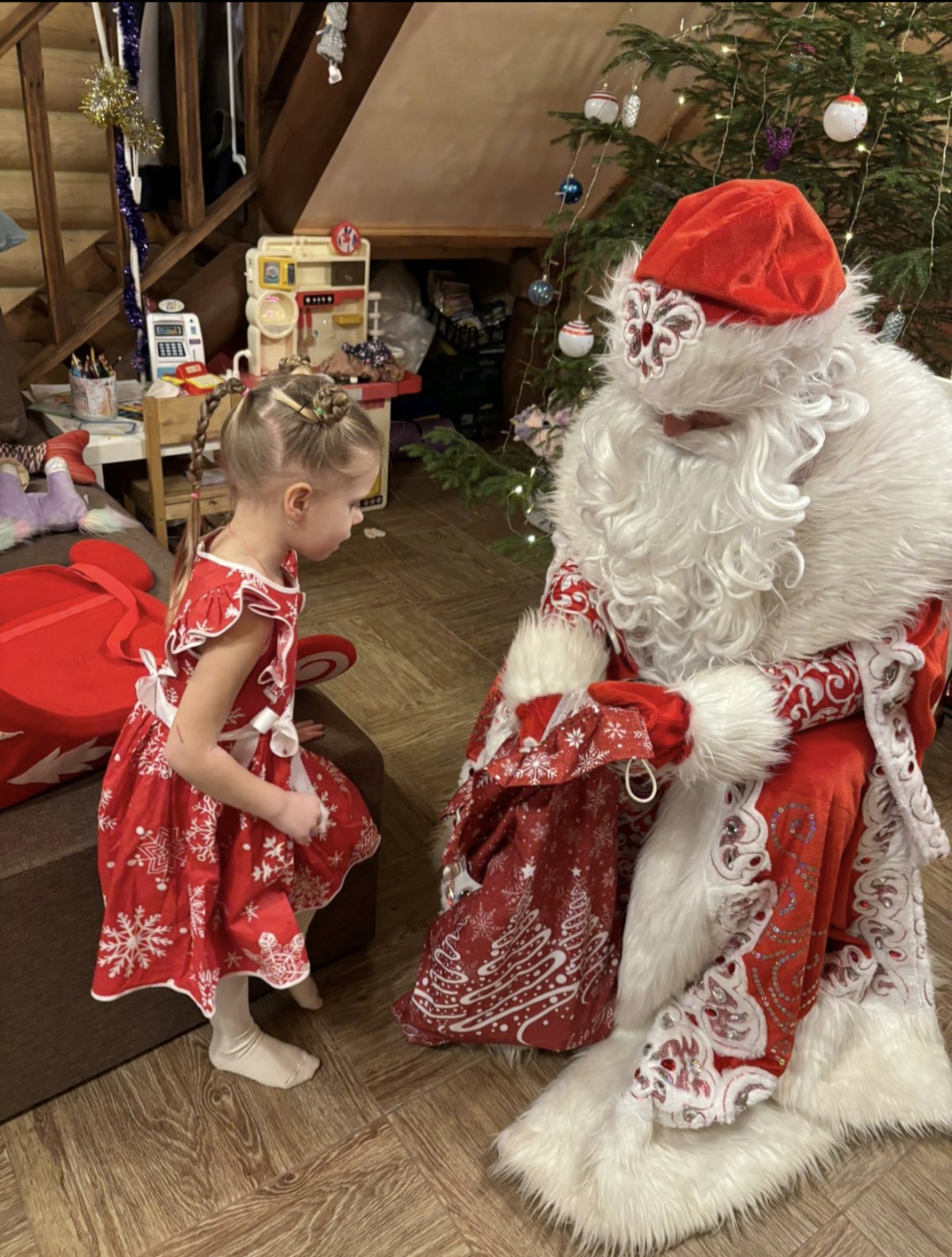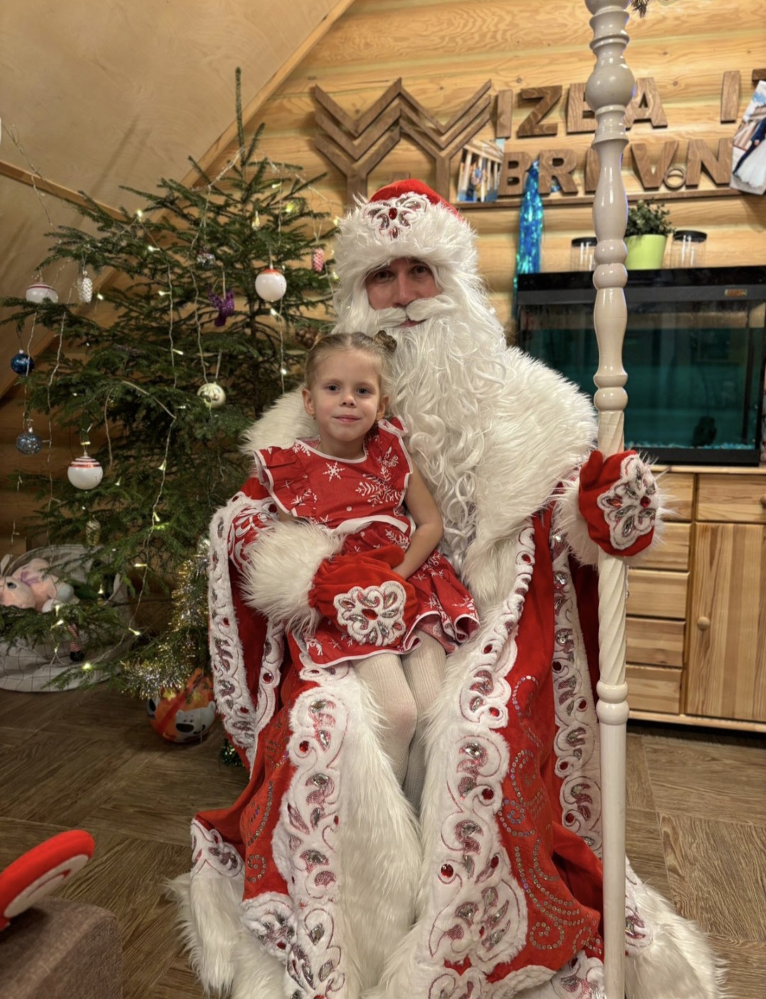 У нашего дедушки Мороза элитный качественный костюм, расшитый «рубиновыми» камнями, профессиональный парик, борода и брови, резной посох росписные валенки и красивый новогодний реквизит.