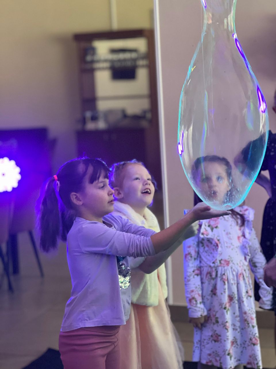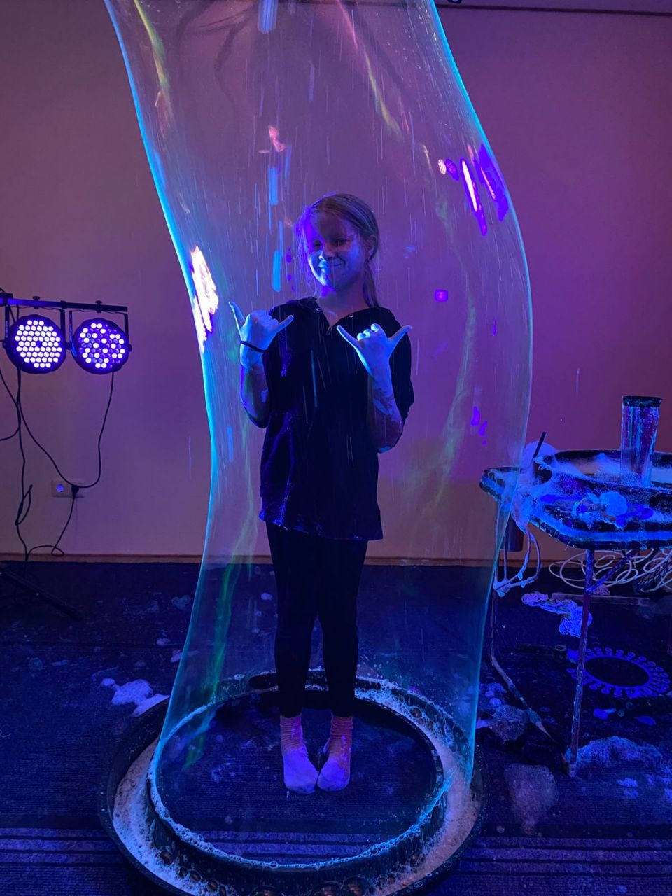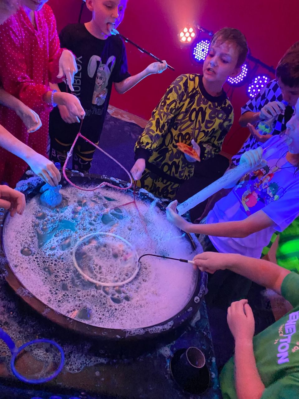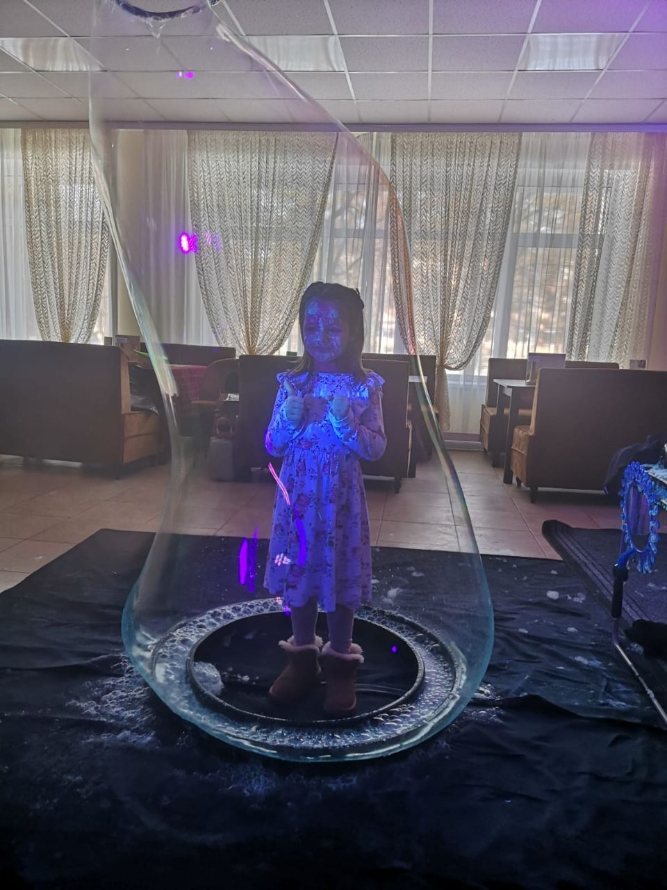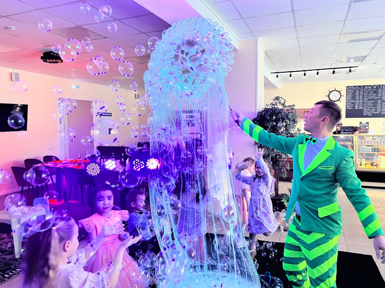 Представьте: свет гаснет и в воздухе начинают появляться светящиеся мыльные пузырики! Дымные пузыри, волшебный пузырляндский дождь — теперь это все еще и светится ! 100% радости и волшебства мы Вам гарантируем! Погружение в мыльный пузырь каждого ребёнка по несколько раз, горящая пена на руках и многое другое.